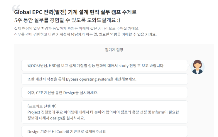 - 5주간의 캠프가 끝나고 나면 플랜트 업종에 대한 이해도는 신입사원 이상으로 높아져 면접시에 충분한 답변 능력을 갖게 될 것입니다.