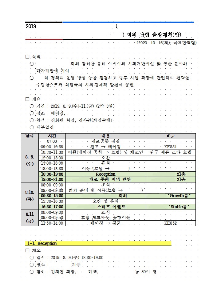 계획안에는 출장기간, 출장자, 목적, 장소 등의 주요 사항과 굵직한 일정표를 포함해야 합니다. 그리고 총장님 보고가 끝나면, 곧바로 전자결제 플랫폼으로