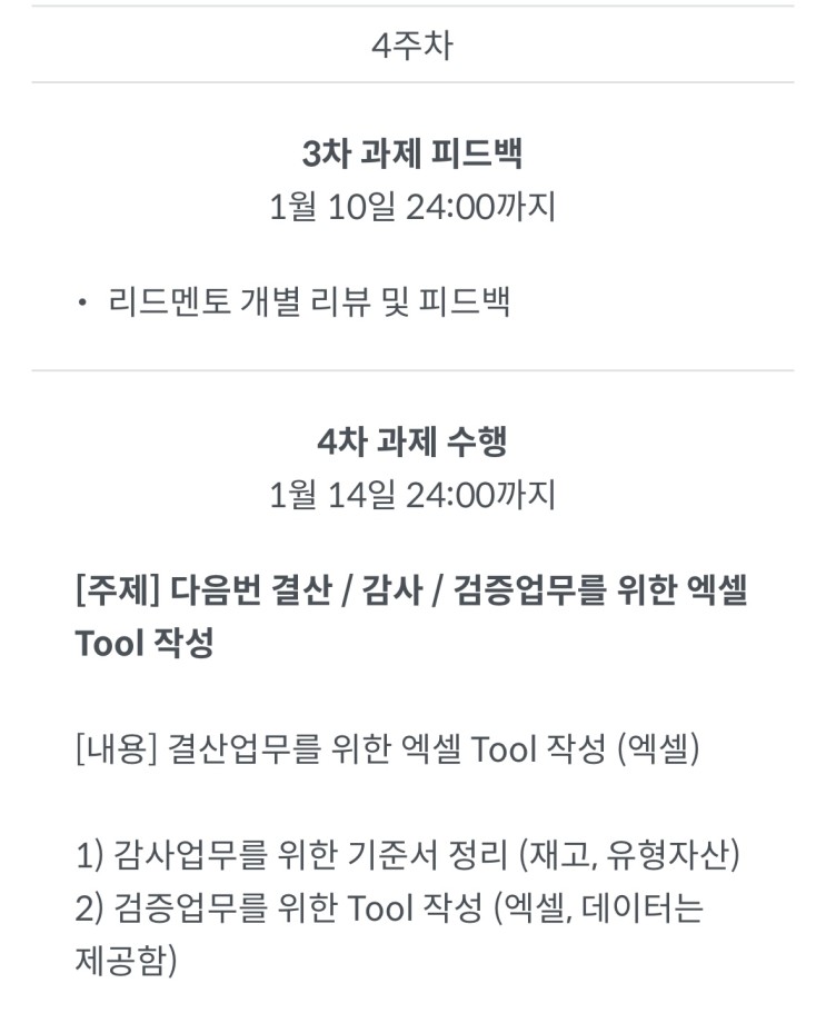 따라서 이번 캠프에서 월차결산 업무를 시뮬레이션을 통하여 진행해보고, 월차결산업무를 위해 중요한 회계지식을 재점검해보려고 합니다. 추가로 감사업무를 위해서는 기준서를 해석하고 논리를 제시하는 업무가 주를 이루는 바, 신규 거래에 따른 기준서 해석 업무를 진행하려고 합니다. 마지막으로 계정점검은 회계팀의 중요하면서도 힘든 업무로, 매출 / 영업 비용 위주의 계정 점검을 해 회계팀에서 수행하는 업무를 간접적으로 체험해볼 수 있도록 과제로 선정했습니다.