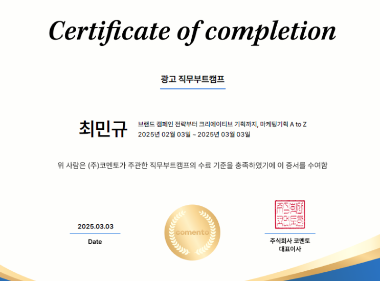 현직자 강의 1회 수강 + 업무 제출 3회 수행시, 교육 수료증이 발급됩니다.