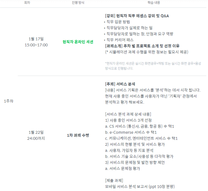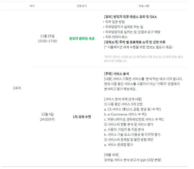 서비스 기획자의 실무를 경험해보고, 이를 발전시켜나갈 수 있는 5주간의 과제가 구성되어 있습니다.