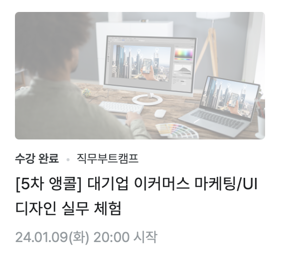 저처럼 다양한 분야에 흥미와 재능이 있는 제너럴리스트 성향의 디자이너라면 이번 캠프를 통해 이커머스 마케팅 디자인이 커리어 방향 중 한 가지가 될 수 있다는 것을 느끼실 수 있을 거에요. 특히나 UI/UX와 그래픽/브랜딩 모두를 놓칠 수 없는 욕심이 있는 분들이라면 이커머스 마케팅 디자인을 강력 추천합니다!