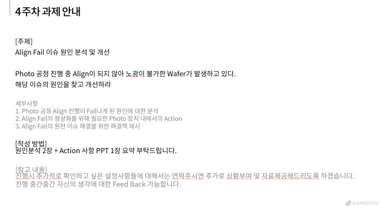 해당 과제를 진행하는 과정에서, Photo Engineer로서 필요한 지식, 문제 접근 & 해결하는 과정에 대해서 배울 수 있으며, 장비부터 공정까지 종합적으로 이슈를 접근하는 시각을 가질 수 있을 것이라 생각합니다. 그리고 무엇보다도, 실제 Engineer의 업무를 수행해보면서, 반도체 Engineer가 자기가 생각했던 직무가 맞는지 그리고 자신이 잘 해낼 수 있는 지를 가늠해 볼 수 있는 의미 있는 시간이 될 것이라고 생각합니다.