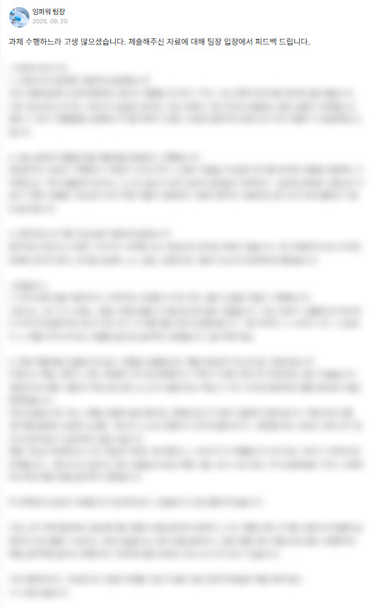 주차 별 업무를 기한 내 제출하지 않은 분들은 개별 업무 피드백을 받을 수 없습니다.