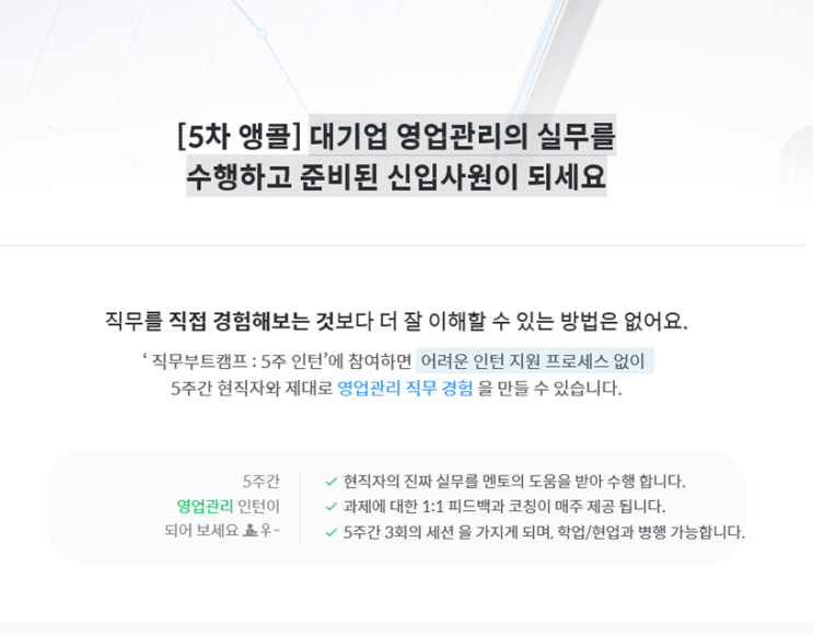 '직무부트캠프: 5주 인턴’에 참여하면 어려운 인턴 지원 프로세스 없이 5주간 현직자와 제대로 영업관리 직무 경험을 만들 수 있습니다.