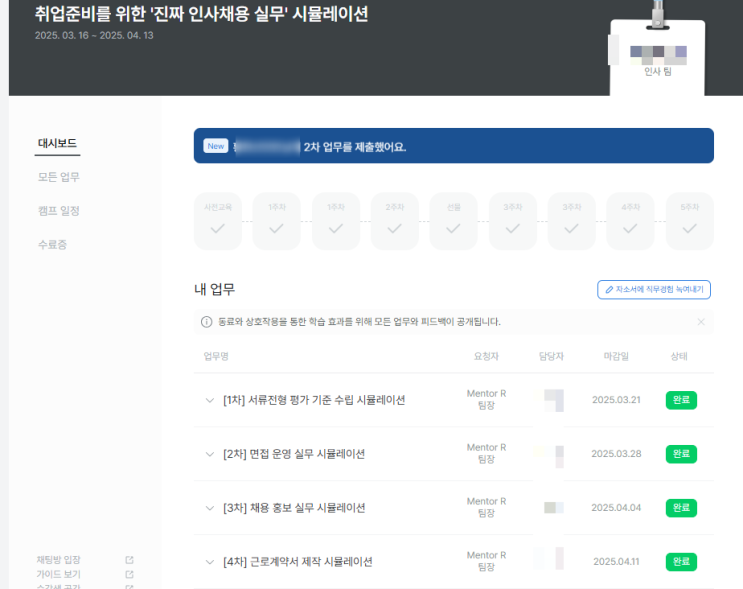 여러분은 구글링/서적 내용을 발췌하여 보고서를 작성하는 내용이 아닌 채용실무자들이 채용의 One Cycle에서 수행하는 가장 중요한 업무들을 5주간 수행하게 됩니다. 해당 과정을 수행함으로써, 채용담당자들이 실무에서 고민하는 지점을 파악하게 되고 각 업무에서 필요한 직무역량 또한 자연히 깨닫게 되리라 확신합니다.