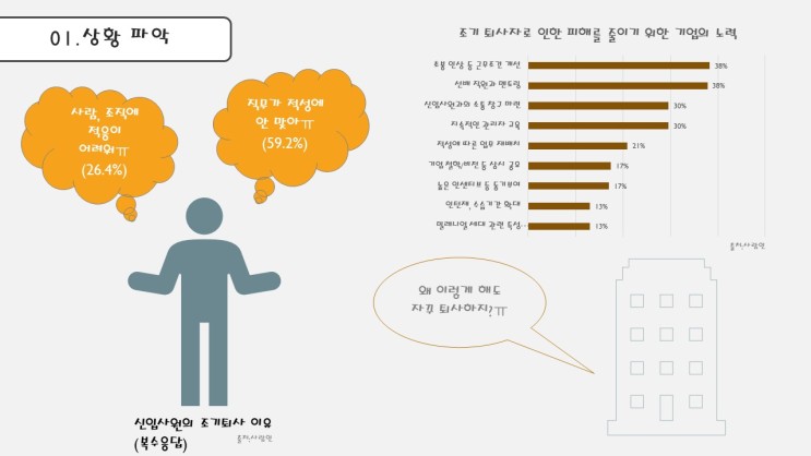 김대리님! 신입사원들이 입사 후 1년 내 퇴사율이 점점 높아져서 걱정입니다. 요즘 신입사원들은 과거 신입사원 보다 스펙이 훨씬 좋은데, 실무에 배치되면 1년도 못버티고 그만두고 있으니 참 답답할 노릇입니다. 그렇다고 연봉을 높이기엔 고정비 증가에 대한 부담으로 어렵습니다. 이번 기회에 신입사원들이 조기 퇴직하지 않고 Soft-Landing할 수 있도록, 채용, 교육, 평가, 보상, 조직문화 방안 등 "신규 입사자들의 퇴직율을 낮추기 위한 HR제도 개선" Project를 담당해주세요.