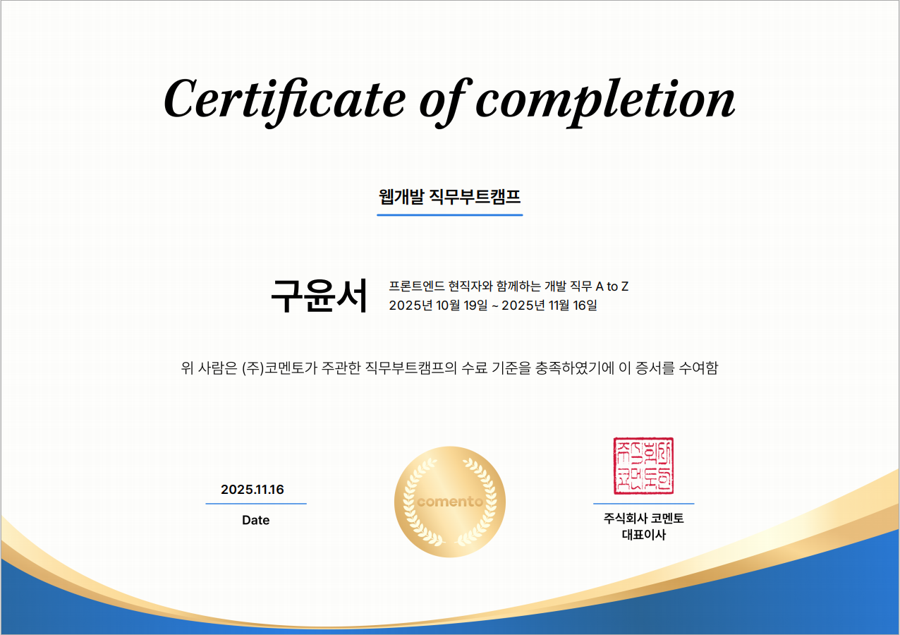 캠프 참여율 80% 이상시 (세션 참여 3회 + 업무 제출 4회 중 총 6회 이상), 교육 수료증이 발급됩니다.