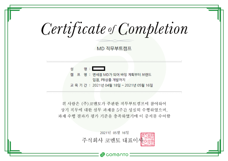 수료증을 토대로 이력서에 직무 관련 경험으로 작성했고 임원 면접시 경험에 대한 질문에 직무 관련한 관심이 많다는 것으로 어필 했고, 좋은 평가를 받을 수 있었어요.