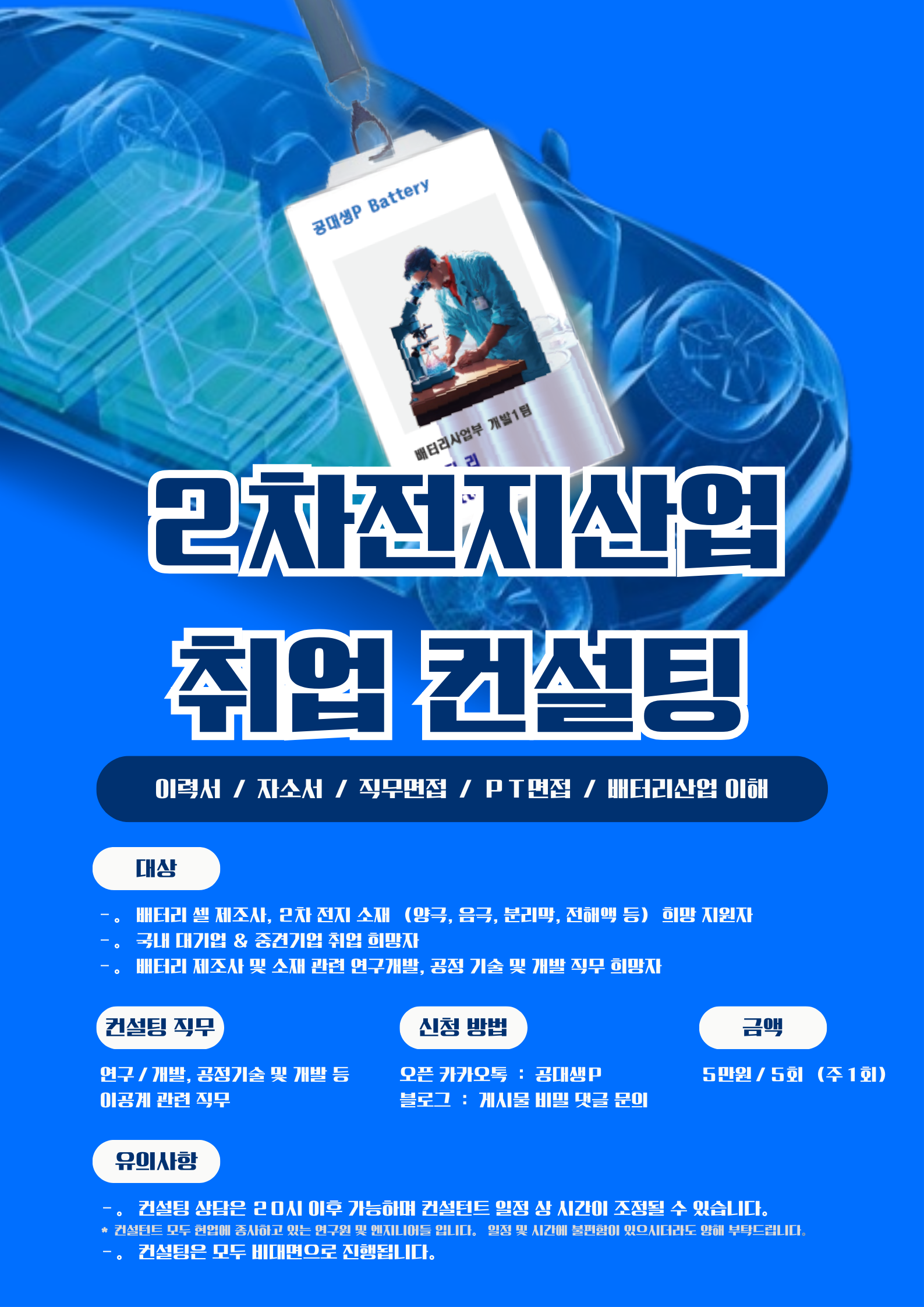 안녕하세요 저는 기계공학부 재학중인 학생입니다. 배터리 분야와 반도체 공정 분야에 관심이 있어 두개와 관련된 활동을 찾아서 진행 중입니다! 최근까지 코멘토 배터리 직무부트캠프를 잘 마무리 하였고, 종합설계(졸논) 주제로 유체를 이용한 반도체 칩 쿨링 프로젝트를 진행중에 있습니다. 종합설계도 성공적으로 잘 마무리 할 수 있을 것 같지만, 조금 더 다양한 활동들을 해보고싶습니다! 취업 면에서는 반도체 쪽으로는 삼성 DS / sk 하이닉스 공정설계 / R&D, 배터리 쪽으로는 삼성 SDI / LG 에너지솔루션을 희망하고 있습니다. 추천하시는 다양한 활동들이나 이런 것들은 했으면 좋겠다라는 것이 있다면 감사히 받겠습니다!