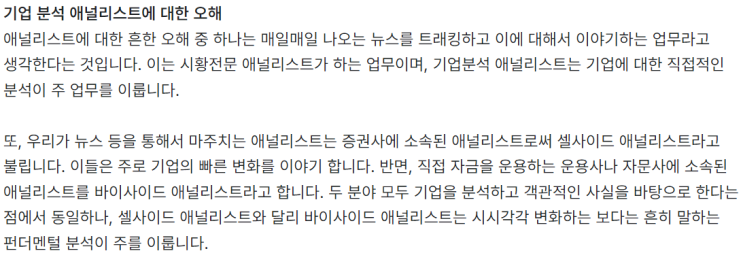 애널리스트에 대한 흔한 오해 중 하나는 매일매일 나오는 뉴스를 트래킹하고 이에 대해서 이야기하는 업무라고 생각한다는 것입니다. 이는 시황전문 애널리스트가 하는 업무이며, 기업분석 애널리스트는 기업에 대한 직접적인 분석이 주 업무를 이룹니다.
