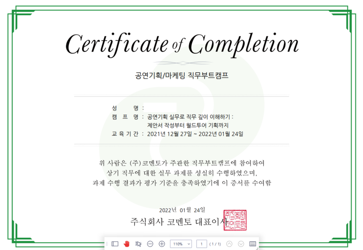 캠프 참여율 80% 이상시 (세션 참여 3회 + 업무 제출 4회 중 총 6회 이상), 교육 수료증이 발급됩니다.