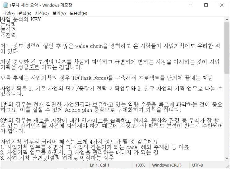 5주간의 캠프가 끝난 후 내가 가고 싶은 회사에 면접을 보러갔을 때, 직무에 대해 이야기를 할 경우가 생긴다면, 꼭 이 캠프에서 경험한 과제를 바탕으로 느꼈던 부분을 어필한다면 큰 무기가 되지 않을까 싶습니다. 사업의 시작과 기본은 시장이고, 현장이고, 고객입니다. 따라서 산업의 환경과 시장을 잘 알아야 사업 기획을 성공적으로 할 수 있으며, 기획과 실행이 선순환 구조로 이루어져야 사업기획 직무의 역할을 충분히 할 수 있다고 생각합니다.