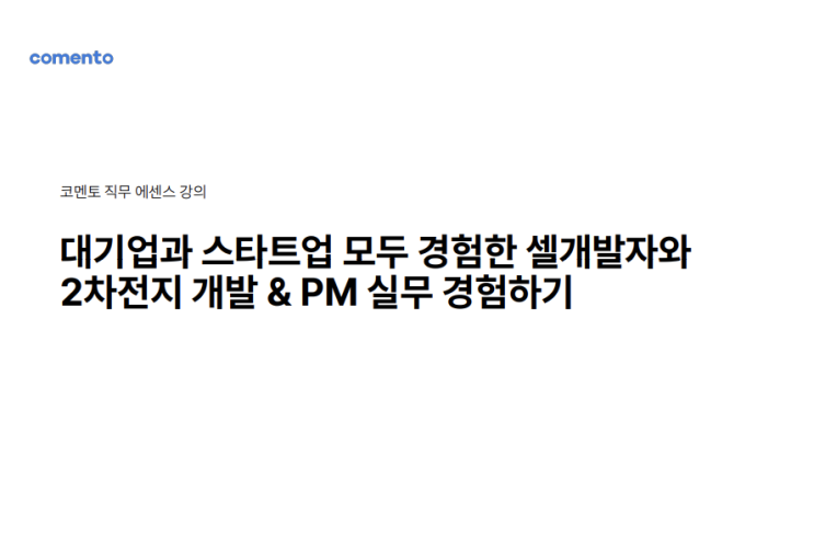 셀개발팀 평가 파트 신입사원으로 시작해 모두가 다 알만한 자동차 OEM 제품 프로젝트 매니저 까지 현업에서 13년의 경험을 가지고 있습니다. 대기업에서 경험한 자동차 전지용 셀 개발은 자동차 부품/공정 개발 Process를 아는 것이 훨씬 중요했습니다. 보통 연구/개발이라고 하면 이론적 지식을 많이 알거나, 석/박사 과정을 꼭 해야만 하는 직무로 오해하는 경우가 많습니다. 하지만 현업에서는 맡은 업무에 대한 책임감, 동료 등과의 소통 능력, 일정 수립/관리 하는 꼼꼼한 계획성 등이 더 많이 필요합니다.