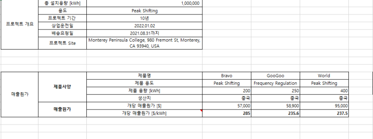 [내용] A사가 미국 California주 Monterey시에 전력 저장 장치(ESS, Energy Storage System)를 설치하는 프로젝트(이하 Monterey 프로젝트)의 견적 요청서를 당사에 보내 왔습니다. Monterey 프로젝트는 전 세계 최대 규모일 뿐만 아니라 A사는 다수의 후속 프로젝트를 보유하고 있어 당사가 반드시 수주해야 하는 건입니다. 당사가 제안할 견적을 산출하고 당사 견적 대응안에 대해 영업담당님께 1 page로 간략히 보고할 수 있게 준비해주세요.