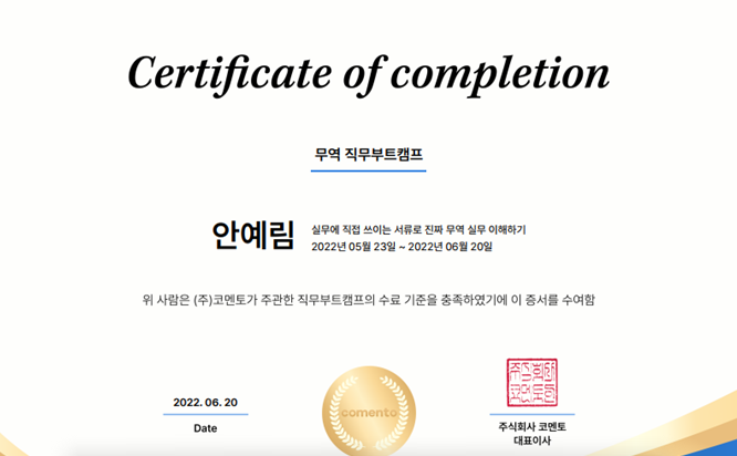 이러한 5주간의 캠프를 통해 중소기업에서의 무역업무란 이렇게 진행된다는 것을 체득하실수 있습니다. 실제 사용하는 서류들을 작성하고 분석해보면 무역실무에 대한 이해도가 크게 높아집니다. 회사에 지원할때도 구체적으로 채용 공고를 분석하실 수 있으며, 해당 회사는 어떤 업무를 하는 사람을 채용할 예정인지에 맞추어 지원서와 면접 방향을 올바르게 설정하실 수 있습니다. 최대한 여러분을 도울 준비가 있는 저와 함께 5주간 많은 정보를 얻어가셨으면 좋겠습니다.
