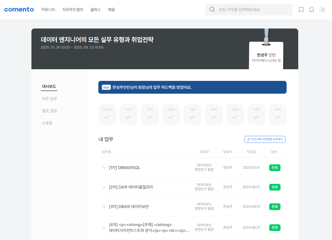 저와 5주간 함께 수행한 업무는 직무경험을 증명할 결과물이 됩니다.
