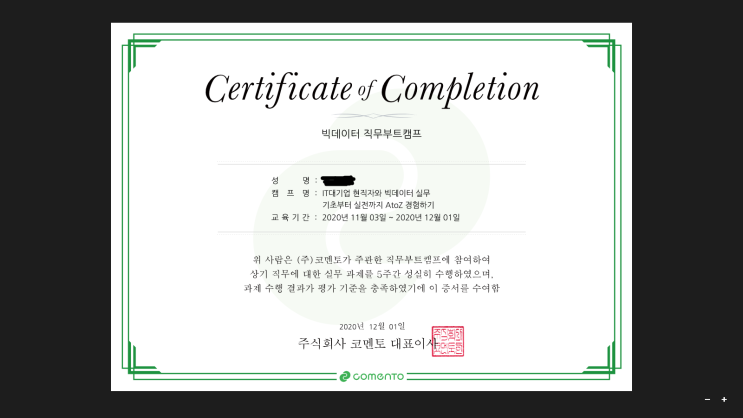 캠프 참여율 80% 이상시 (세션 참여 3회 + 업무 제출 4회 중 총 6회 이상), 교육 수료증이 발급됩니다.