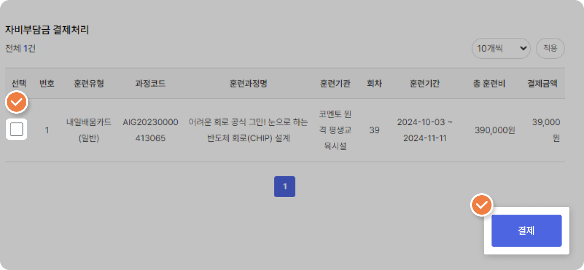 신청한 강의를 선택 후 결제